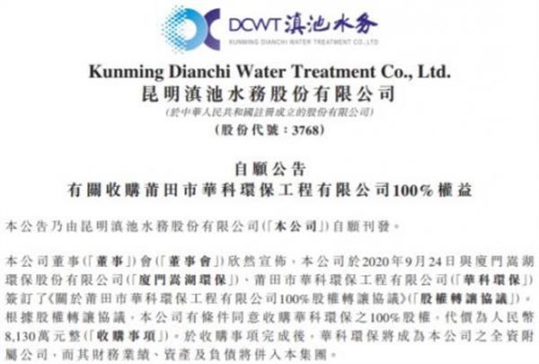 收購?fù)瓿珊螅A科環(huán)保將成為滇池水務(wù)全資附屬公司,而其財(cái)務(wù)業(yè)績、資產(chǎn)及負(fù)債將并入滇池水務(wù)。